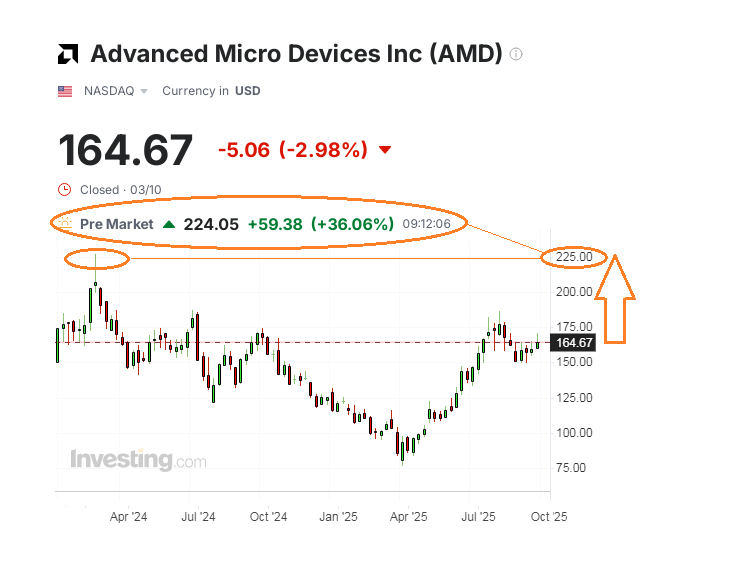 Das ist fantastisch! They were only away a matter of minutes, perhaps no more than a quarter of an hour since this news began spreading around the wires, but AMD capitalization already soared by 36%. ChatGPT creators, OpenAI, want AMD chips for its ever-growing AI projects and even get an option to buy up to roughly 10% of AMD at the same time (160 million shares of AMD for 1 cent each over the course of this great deal). AMD stock, which was lagging from the AI industry's mainstream for so many months, immediately skyrocketed from nearly $165 at last week close to well above $225 at Monday pre-market. It's their highest level since very short-lived historical peaks in March 2024. Do you remember, when this asset was trading below $100 for a short time, I always told you that everything would be fine with AMD over time? But even I could not have imagined such a meteoric rise.
