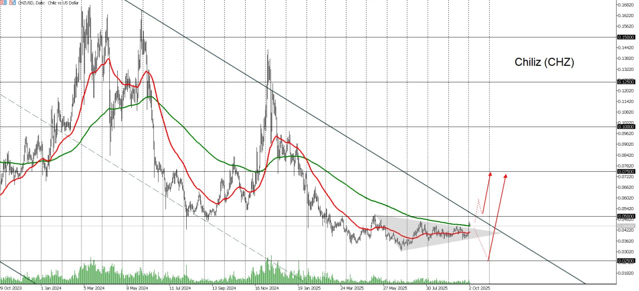 Chiliz (CHZ) surged 11.3% this week to $0.0443, outpacing the broader crypto market, where Bitcoin (BTC) advanced 8.5% to $120,140. With BTC breaking above the $117,000–$119,000 resistance zone, momentum is building for a potential rally toward $155,000–$165,000, creating a supportive backdrop for altcoins.